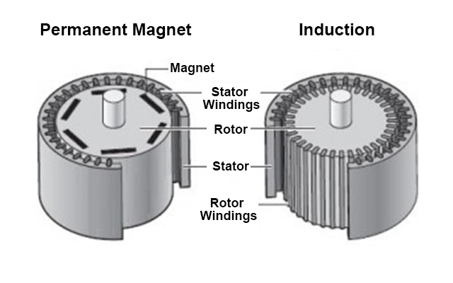 One major difference between the two motor designs is cost and durability. Permanent magnet motors tend to be more expensive than induction motors due to the rare earth materials (such as neodymium or samarium) used to make their permanent magnets, which are more expensive than the copper and aluminum used in induction motors.
