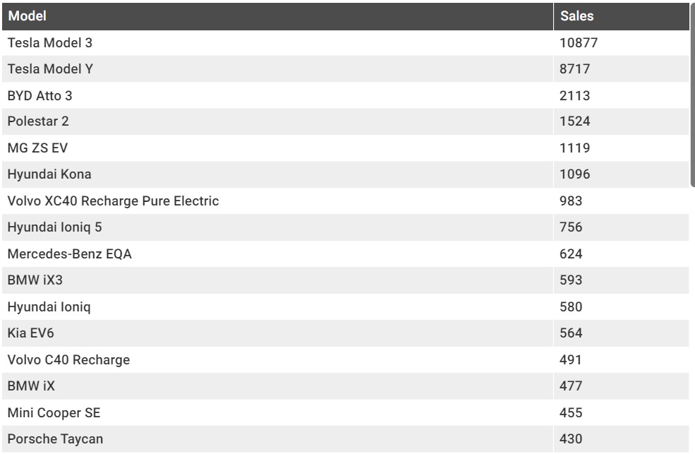 Around three in five electric cars sold last year were Tesla badges, amounting to 19,594 vehicles. The best-selling non-Tesla electric vehicle in 2021, China’s MG ZS EV small SUV, was dethroned last year by another newcomer from China, the BYD Atto 3 small SUV.