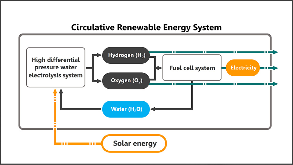 Honda’s circulative renewable energy system, which combines its high differential pressure water electrolysis system and a fuel cell system, is designed to continuously produce oxygen, hydrogen and electricity from solar energy and water.