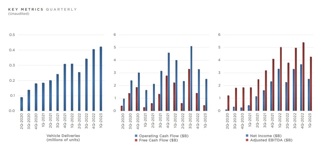 - The company’s financial performance was boosted by growth in vehicle deliveries and other parts of the business