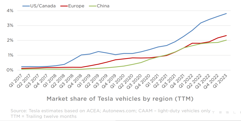 Tesla’s Shanghai factory has been running near full capacity for several months, so the company does not expect a meaningful increase in weekly production run rate. The company launched sales in Thailand, which has had a very positive reception. Giga Shanghai remains Tesla’s main export hub. In Germany, the Model Y production line produced over 5,000 vehicles in a week towards the end of Q1. The Tesla Model Y became the best-selling vehicle in Europe in Q1-2023, of any kind, according to IHS and other latest available data.
