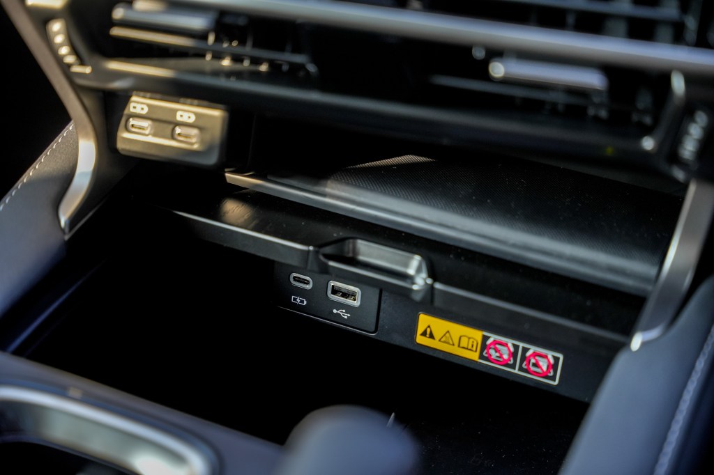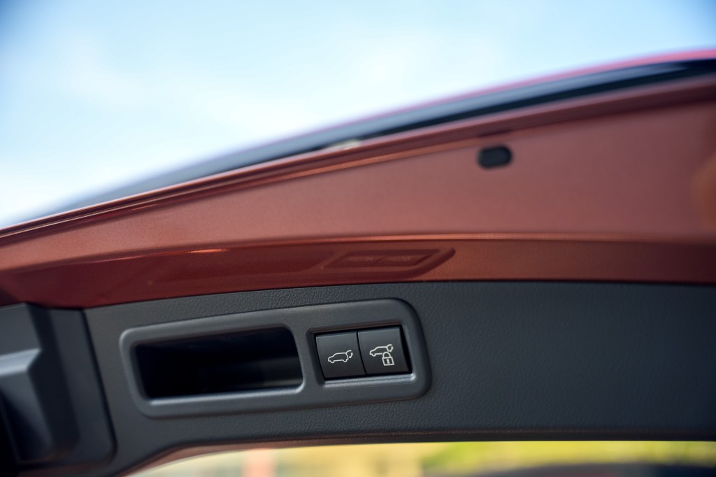 The E-latch system, combined with the Blind Spot Monitor with Safe Exit Assist (SEA), enhances safety by warning drivers of approaching vehicles or cyclists and preventing accidental door openings.