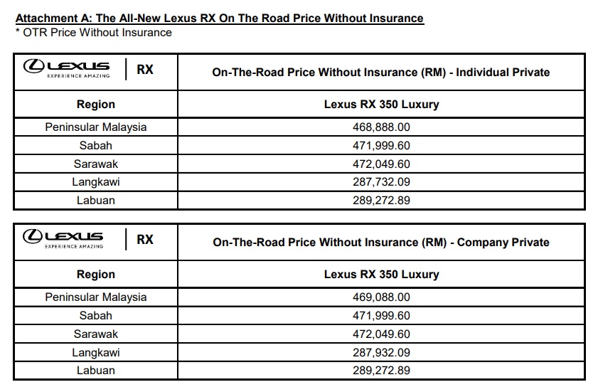- With a starting price of RM468,888 on the road without insurance, the RX 350 Luxury comes with a warranty coverage of 5 years with unlimited mileage.