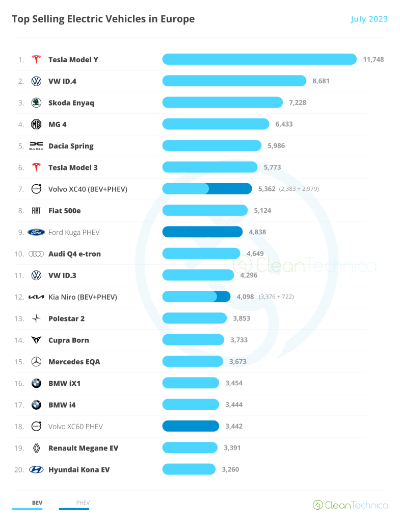 1. Tesla Model Y – Untuk bulan ke-9 berturut-turut, crossover Tesla adalah EV terlaris di Eropah. Pada bulan Julai, Model Y mempunyai 11,748 pendaftaran. Tahun ini boleh dianggap sebagai “Puncak Model Y” di Eropah.