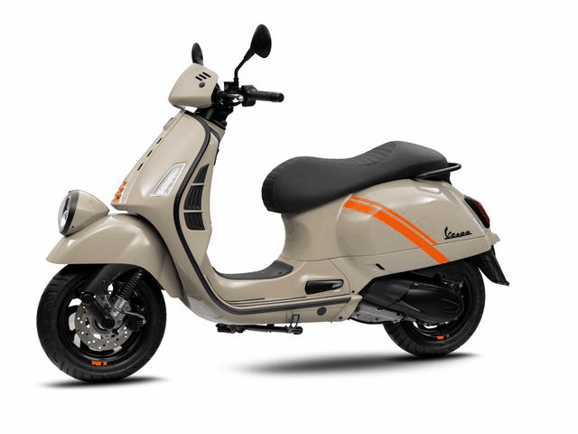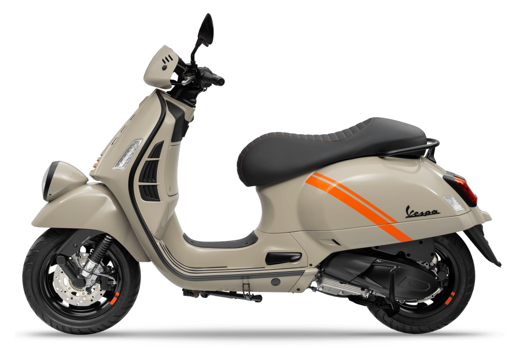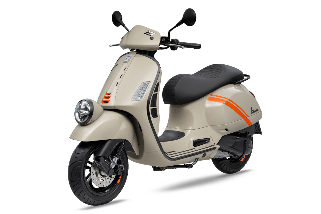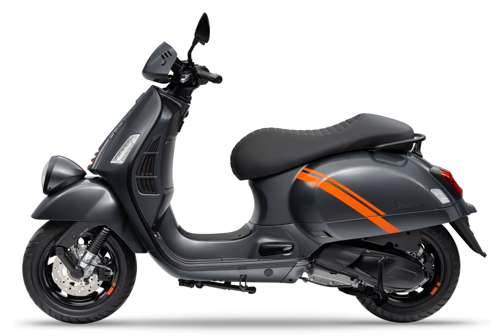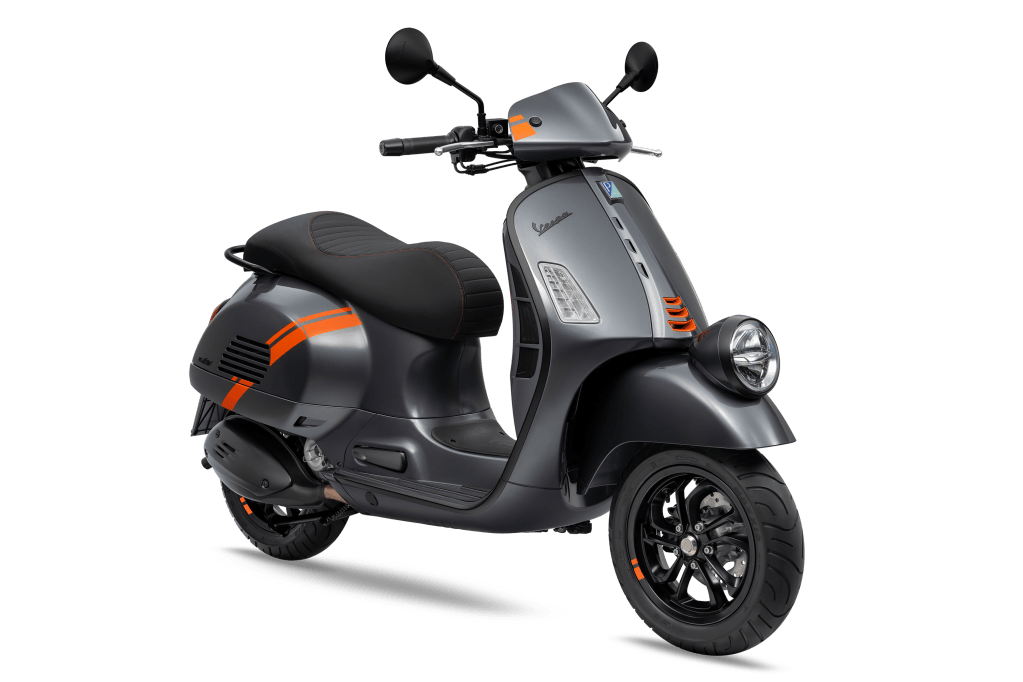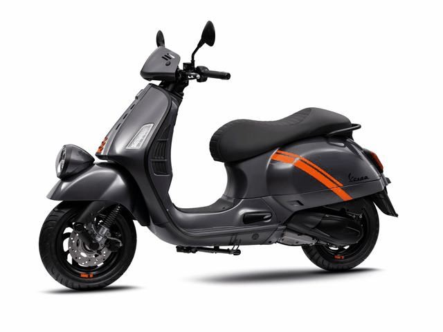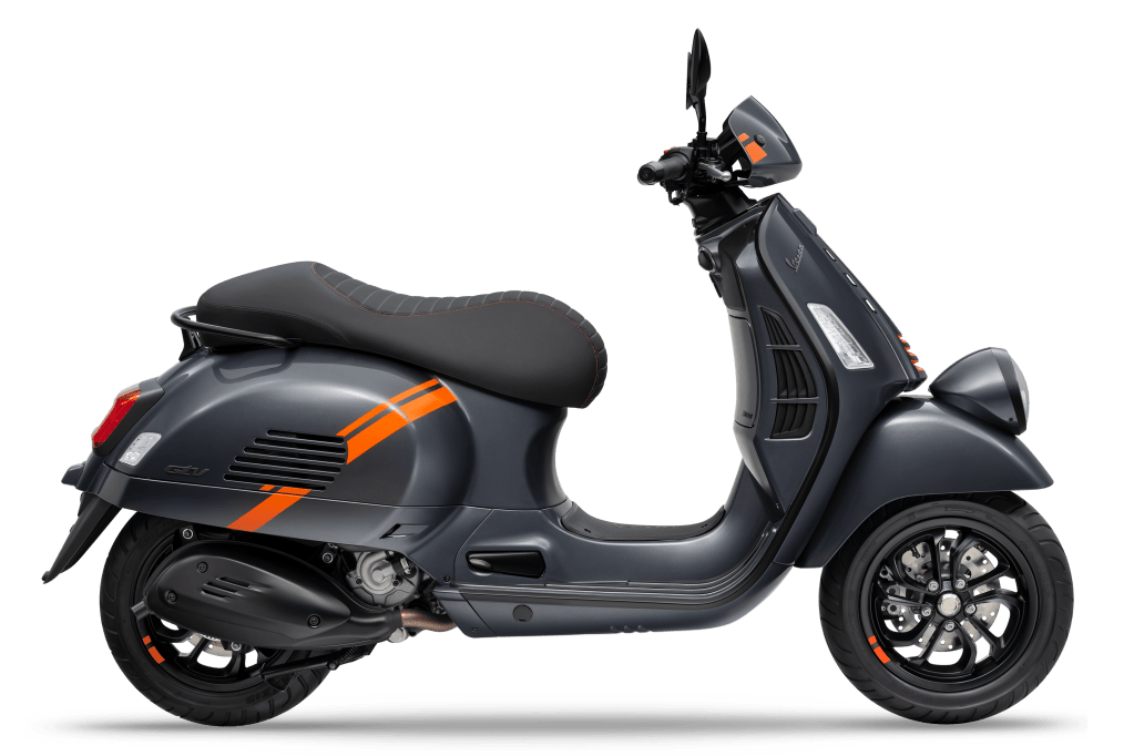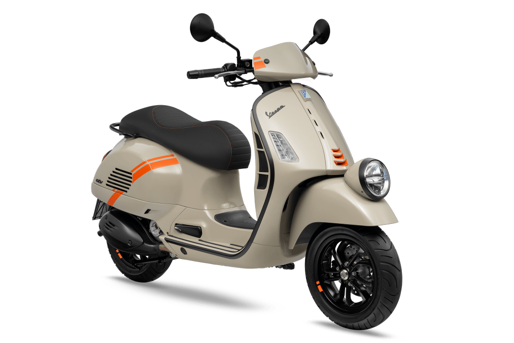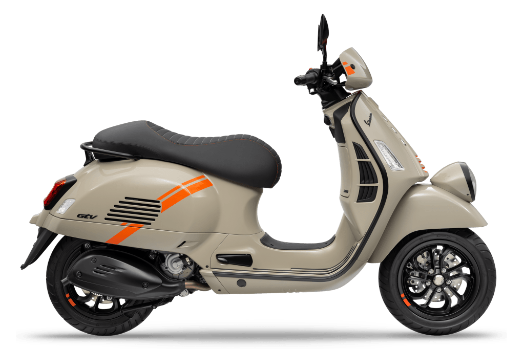 Pandangan keseluruhan Vespa GTV menonjol dengan penyelesaian hitam matte yang menghiasi bingkai lampu depan rendah dan gugus lampu belakang, profilnya di sepanjang perimeter badan, pegangan penumpang dan tapak kaki, penutup penyelapang, cermin retro, dan pemegang dan bingkai pemeterian. Vespa GTV yang baru boleh didapati dalam skema warna Beige Sabbia Glossy dan Grey Titanio Glossy yang khas dengan grafik oren yang bergerak mendatar di seluruh panel samping.