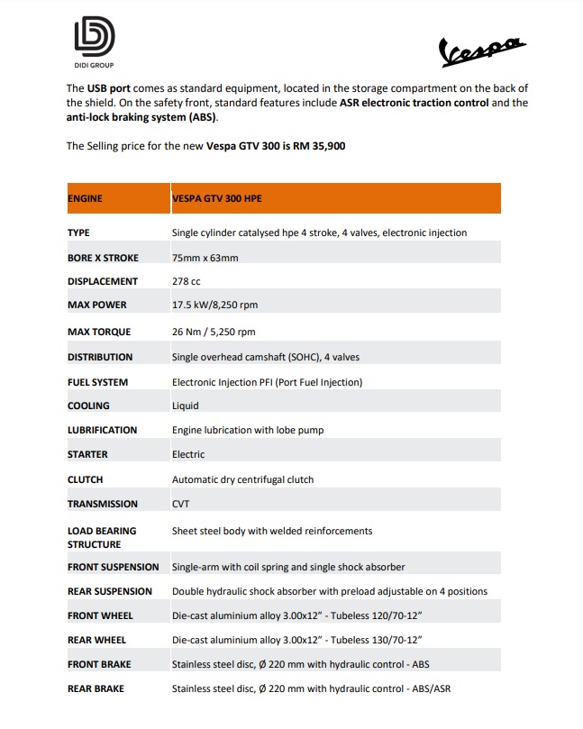 Harga jualan Vespa GTV 300 yang baru adalah RM 35,900.