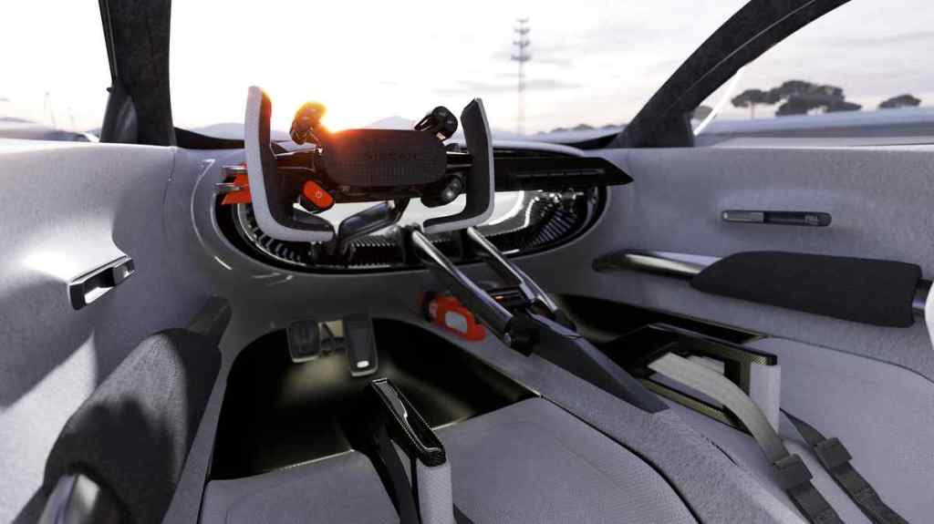 Dalaman ini adalah tafsiran futuristik mengenai fungsi asas kereta perlumbaan, dengan hanya beberapa skrin yang menunjukkan maklumat penting tanpa gangguan yang minima – mencerminkan di mana kereta perlumbaan sebenar – seperti penyertaan Formula E Nissan – mengilhami penyediaan simulator perlumbaan dalam talian.