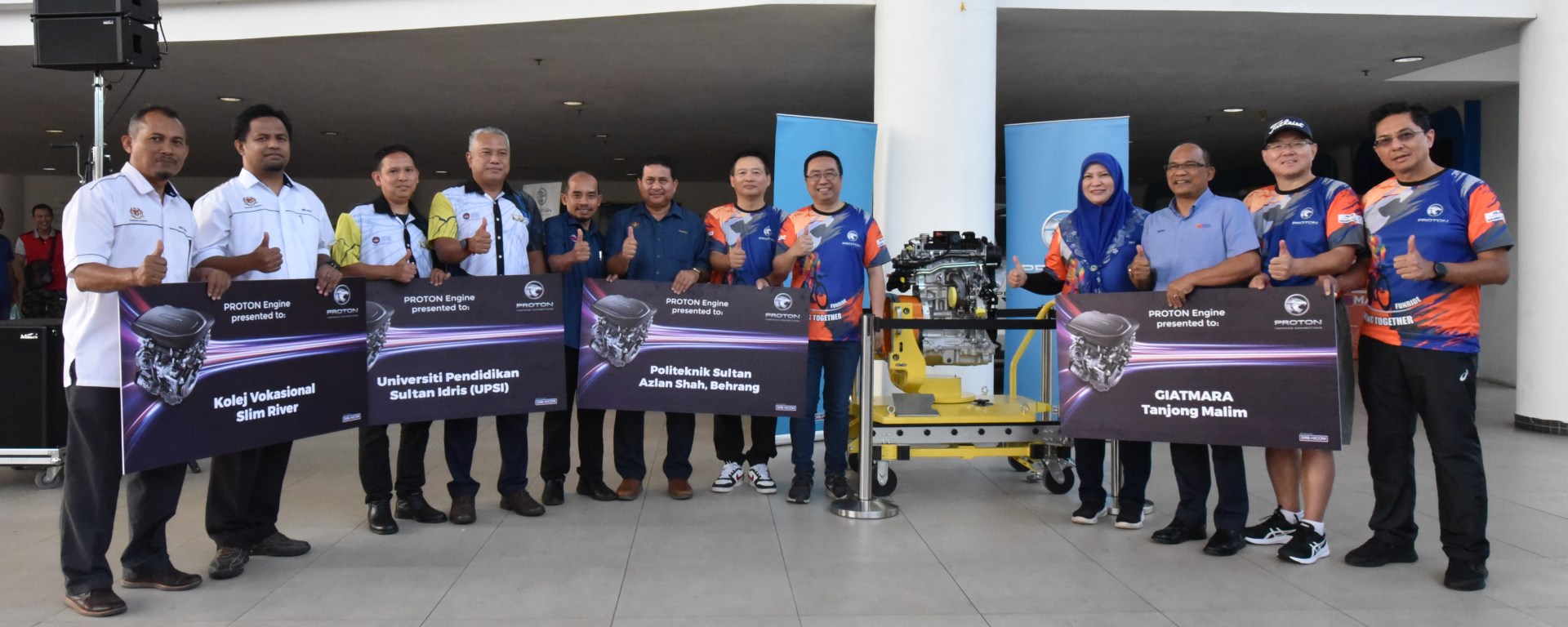 Penerima enjin-enjin tersebut adalah Politeknik Sultan Azlan Shah, Behrang, Kolej Vokasional Slim River, Giat Mara Tanjong Malim, dan Universiti Pendidikan Sultan Idris, Tanjong Malim. Enjin PROTON berprestasi 1.5 TGDi yang telah menang anugerah ini dipasang di atas talian pengeluaran yang terkawal iklim di kilang PROTON Tanjong Malim dan terkenal dengan teknologi dan prestasinya yang canggih. Enjin-enjin ini akan memberikan pelajar peluang latihan praktikal dan meningkatkan pengetahuan mereka dalam perkhidmatan dan pembangunan enjin, membantu menyelaraskan kemahiran mereka dengan permintaan industri.