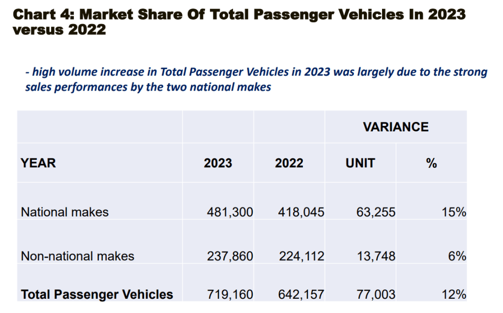 Kedua-dua segmen Kenderaan Penumpang dan Kenderaan Komersial menyaksikan pertumbuhan dalam jualan. Kenderaan Penumpang mencatatkan peningkatan yang besar, meningkat dari 642,157 unit pada tahun 2022 kepada 719,160 unit pada tahun 2023, dengan pembuat tempatan mendominasi bahagian pasaran. Segmen Kenderaan Komersial mengalami pertumbuhan sederhana sebanyak 2%, mencapai 80,571 unit.