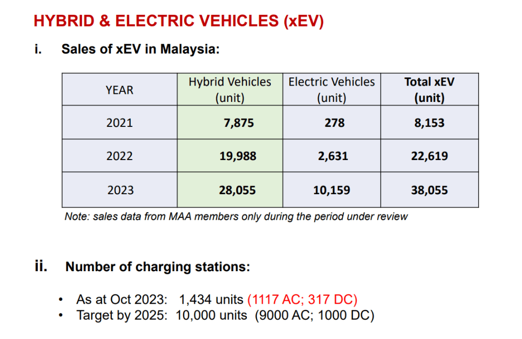 Kenderaan elektrik (xEV) memberikan impak besar, menyumbang kira-kira 5% kepada TIV, dengan peningkatan yang luar biasa sebanyak 69% dalam jualan xEV dari tahun 2022. Momentum positif yang berterusan dijangka akan terus berkembang dengan sokongan kerajaan dan pengenalan model xEV yang baru.
