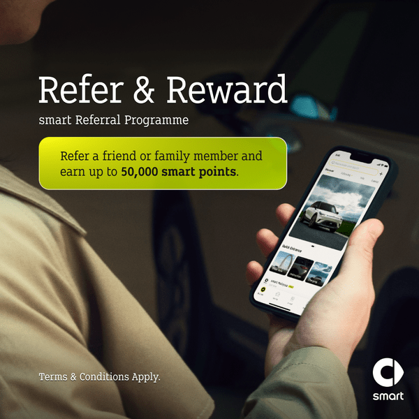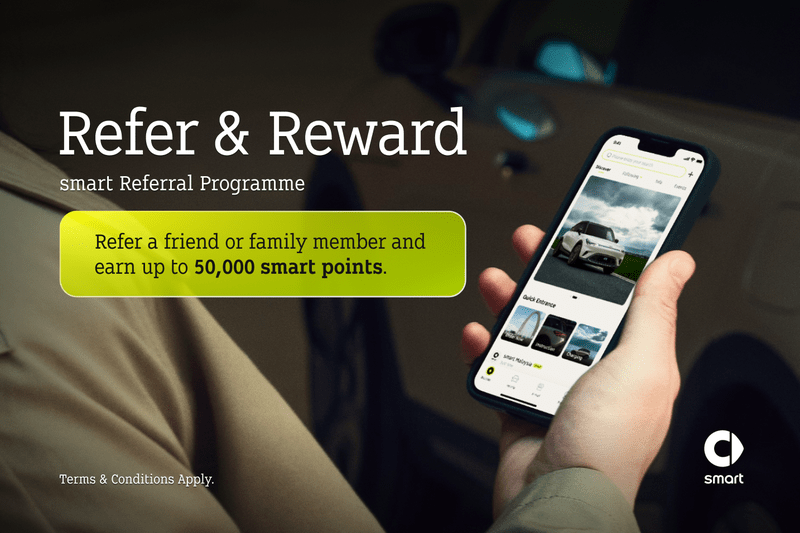 Di bawah program ‘Refer & Reward’, pemilik smart boleh mendapat ganjaran yang hebat untuk penyertaan mereka. Bagi setiap ujian pemanduan yang berjaya diatur melalui rujukan, pemberi rujuk akan menerima 5,000 smart Points, setara dengan RM50. Ganjaran meningkat bagi rujukan yang berjaya menghasilkan pendaftaran kenderaan, dengan pemberi rujuk memperoleh 50,000 smart Points, setara dengan RM500. Ini lebih memberi insentif kepada mereka untuk memperkenalkan orang lain kepada dunia kepemilikan premium smart. Tambahan pula, pemilik smart sedia ada yang membeli kenderaan smart elektrik sepenuhnya baru akan diberikan 100,000 smart Points, setara dengan RM1,000.