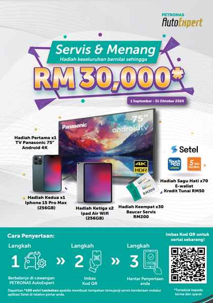 Jangan lepaskan peluang untuk memenangi hadiah keseluruhan yang bernilai tinggi ini! Imbas Kod QR sekarang dan sertai peraduan yang ditawarkan oleh PETRONAS AutoExpert. Terma dan syarat dikenakan.