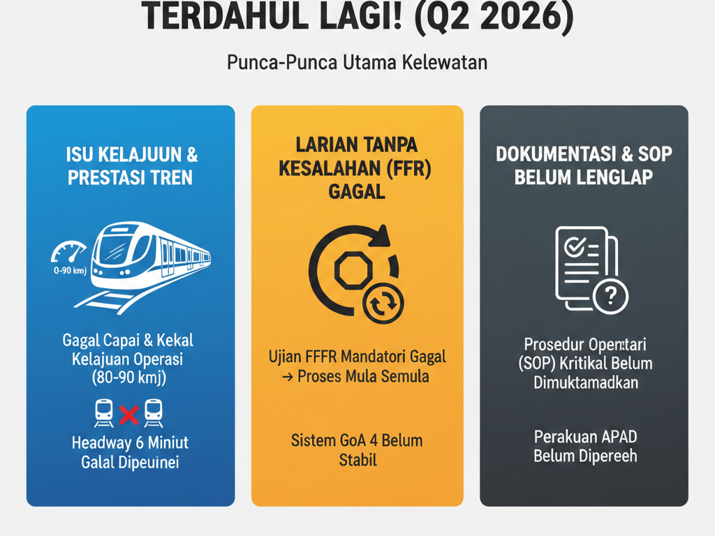 - Implikasi Perkhidmatan: Jika tren tidak dapat mengekalkan kelajuan ini secara berulang dan boleh dipercayai, jurang perkhidmatan yang dirancang (dikenali sebagai headway) selama enam minit akan menjadi mustahil untuk dicapai. Keadaan ini akan menjejaskan kapasiti dan kekerapan perjalanan bagi penumpang, sekali gus melanggar spesifikasi yang termaktub dalam Skim Keretapi projek tersebut.