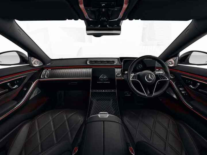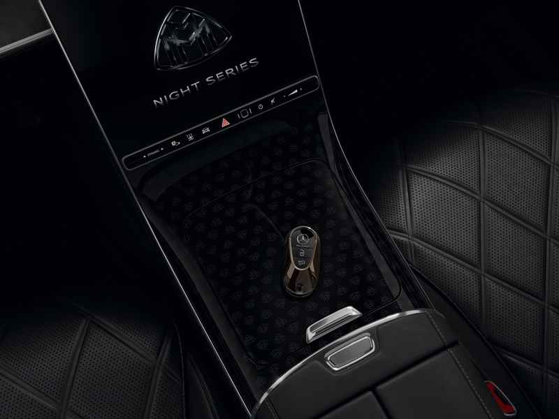 Keistimewaan lanjut dinyatakan melalui ambang pintu bercahaya dengan tulisan “MAYBACH Night Series”, roda aloi ringan Maybach 7-spoke 20-inci dalam warna hitam dan dark shadow gloss dengan elemen aerodinamik bersepadu, serta kunci kenderaan dalam warna hitam berkilat tinggi dengan bingkai trim dark shadow gloss.